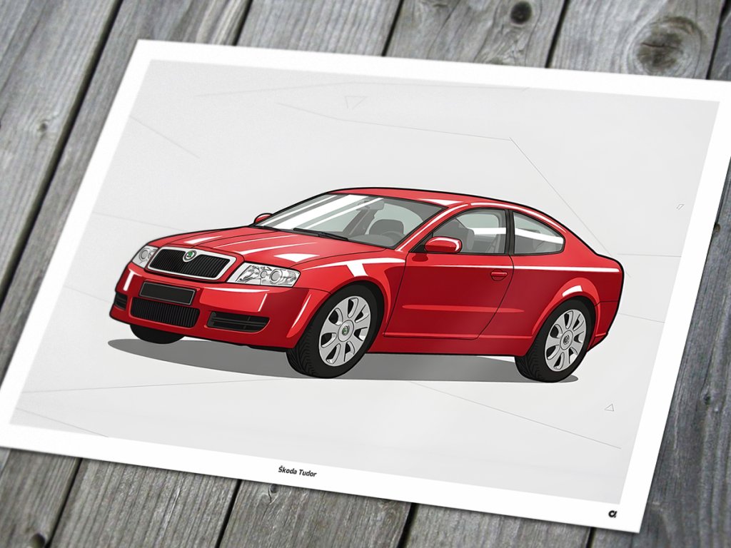 Plakát zachycuje jedinečný koncept Škoda Tudor, který byl představen v roce 2002 jako dvoudveřové kupé na bázi modelu Superb první generace. Vznikl ve Škoda Auto Design Centre pod vedením tehdejšího šéfdesignéra Thomase Ingenlatha. Tudor spojoval elegantní linie, sportovní charakter a praktičnost, čímž přinesl nový pohled na to, jak může vypadat české kupé.